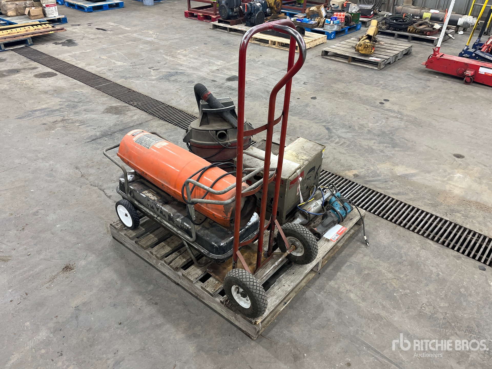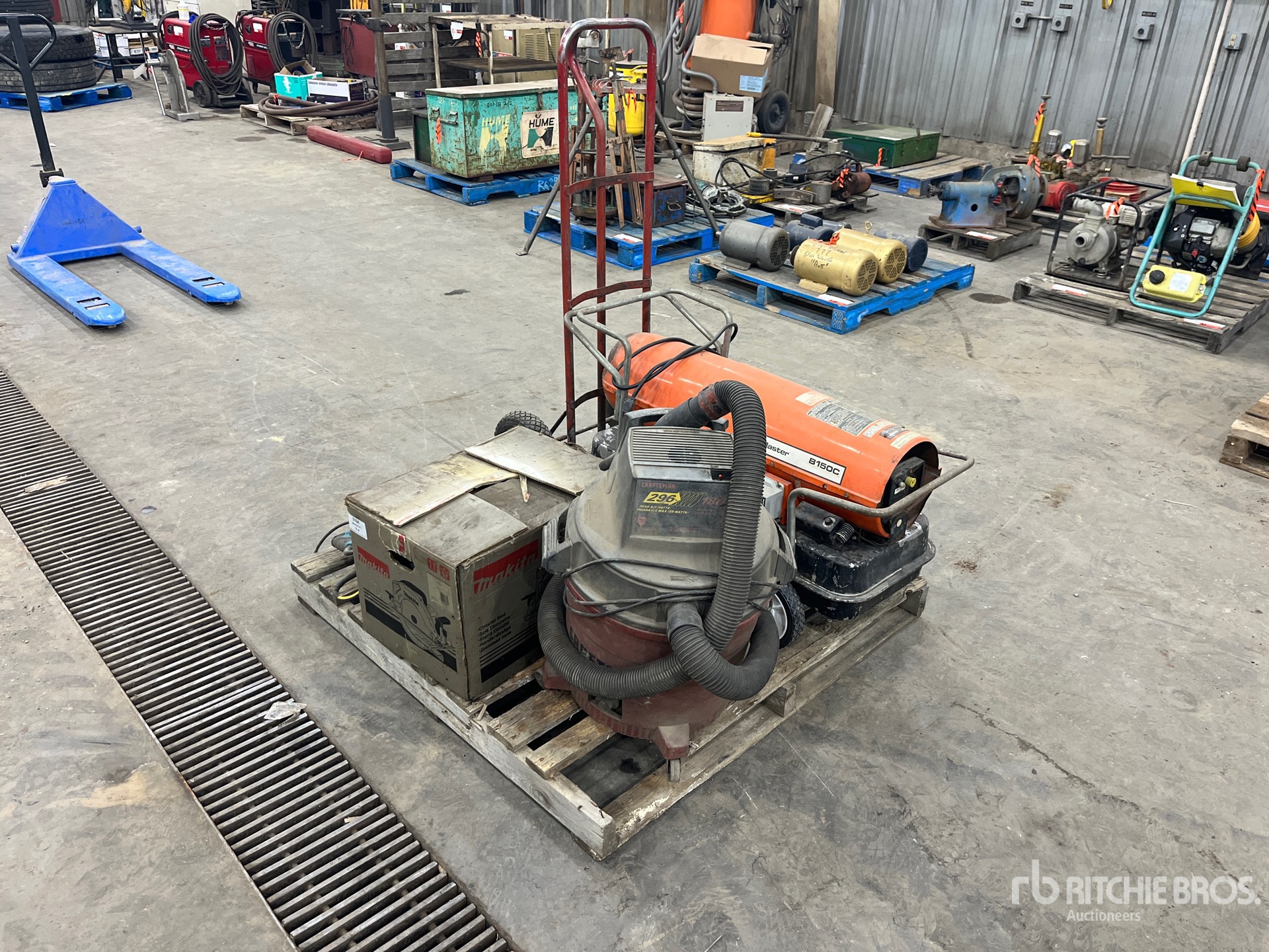 Master B150C Heater, Makita Reciprocating Saw, Makita Portable Grinder, (Unused) Makita Skill Saw, Craftsman Shop Vacuum, Dolly