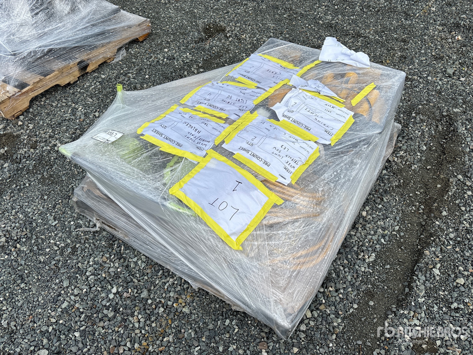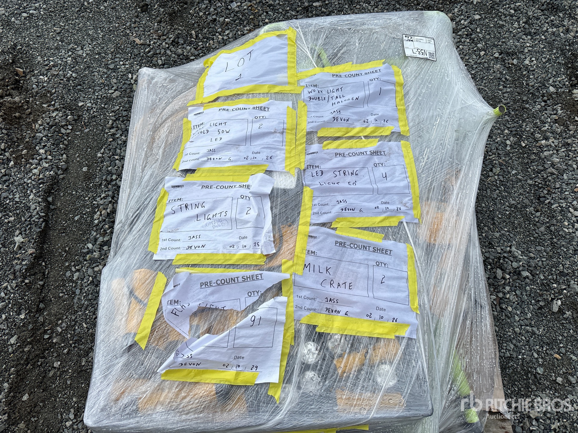 (2) 50 W Trifold LED Work Lights, (1) Double Tall Halogen Work Light, (4) 50 ft LED String Work Lights, (2) String Lights, (2) Milk Crates, (91) Flashlights