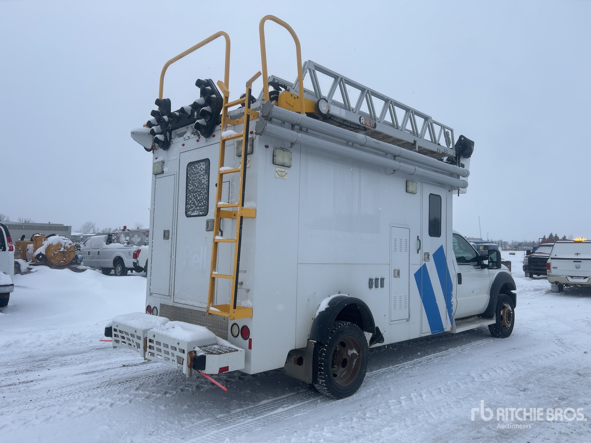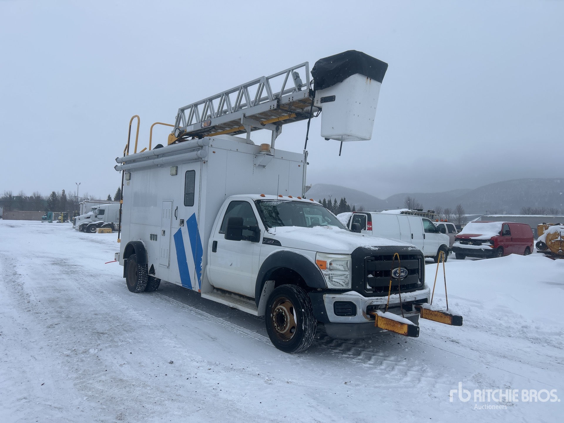 Triton V10 6.8 L Gasoline Engine, 2011 US EPA Label, CARB Compliant, Automatic Transmission, 6500 lb Front Axle, 14706 lb Rears, 8845 kg GVWR, 225/70R19.5, Spring Suspension, 189 in Wheelbase, Rear Mounted, One-Person Telescopic Boom, Utility Body, Oman 6500 W Diesel Generator Set, 13 ft x 82 in Bed, Aluminum Frame