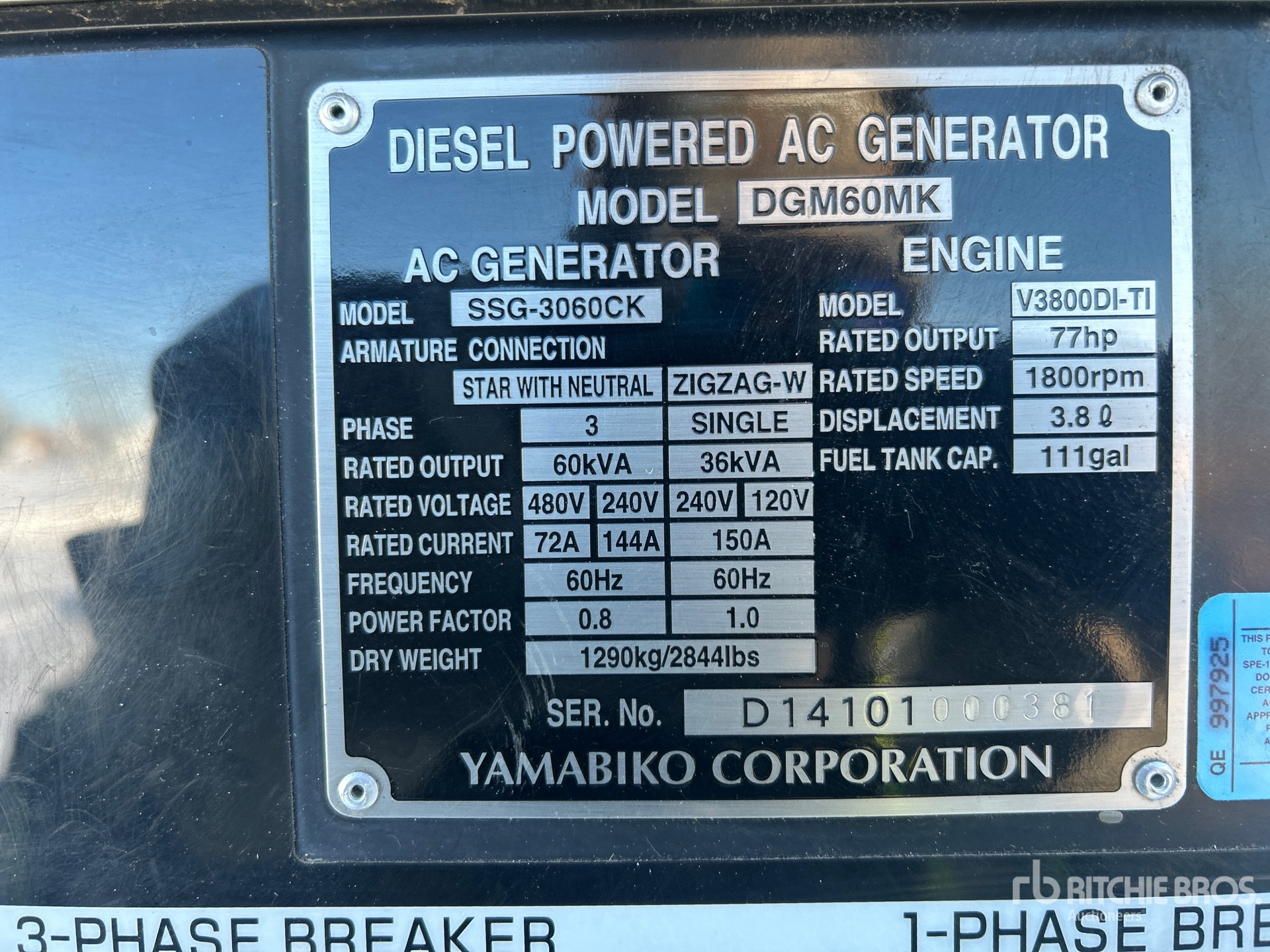 Kubota 4 Cylinder Diesel Engine, Positive Air Shutoff, 60 kVA/48 kW Rated 3 Phase Output, 208 V / 220 V / 240 V Rated Voltage, 36 kVA,/36 kW, Rated Single Phase Output, 120 V / 139 V Rated Voltage, 230 V & 400 V Receptacles, Bottom Mounted Fuel Tank