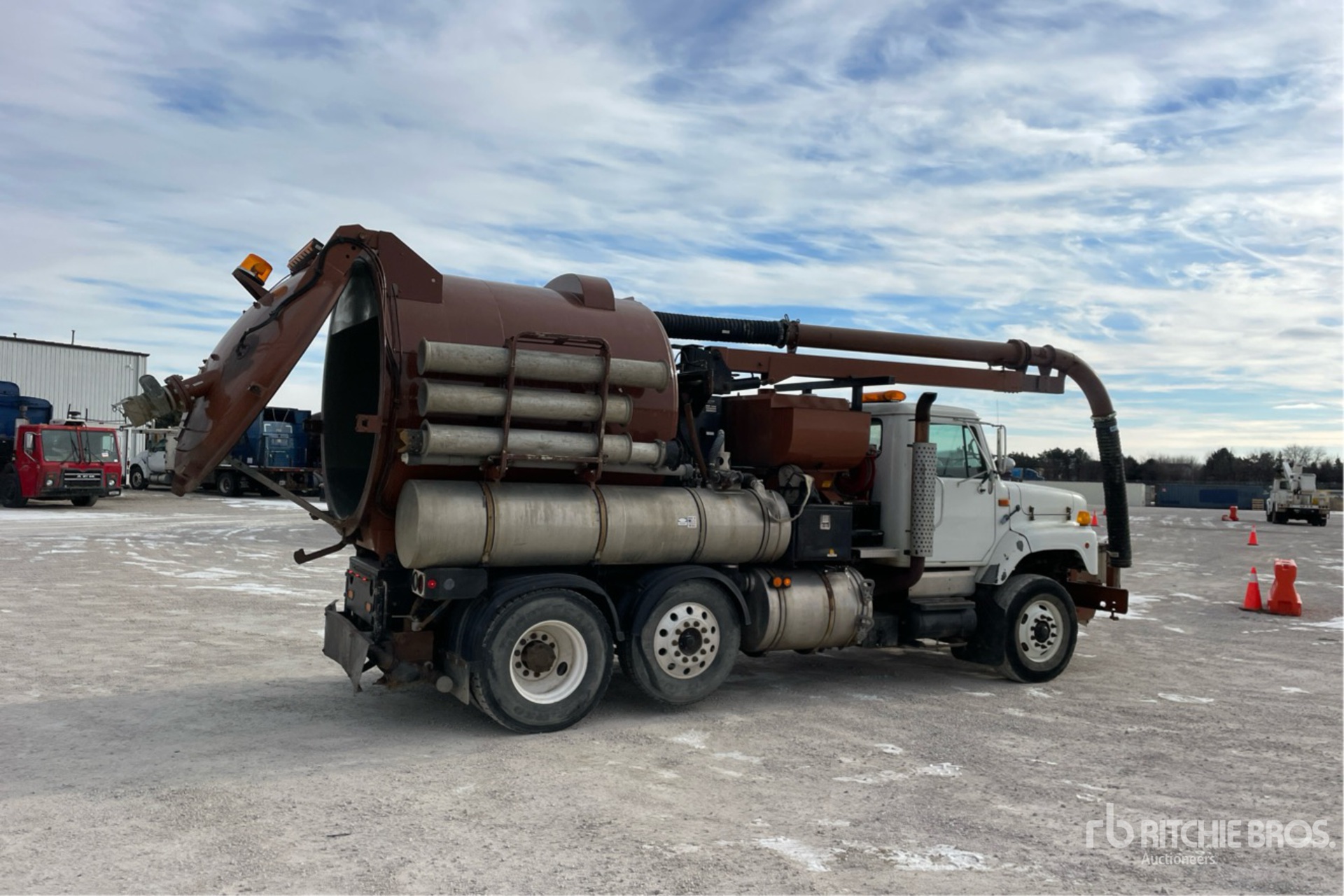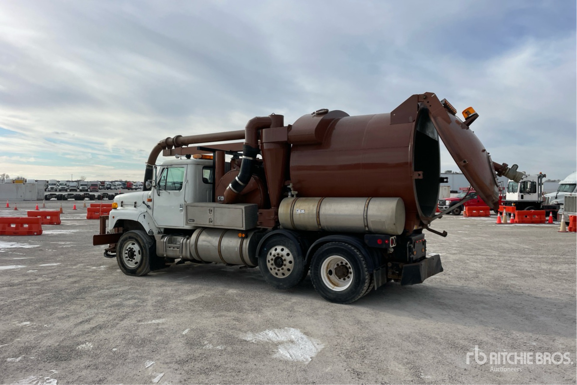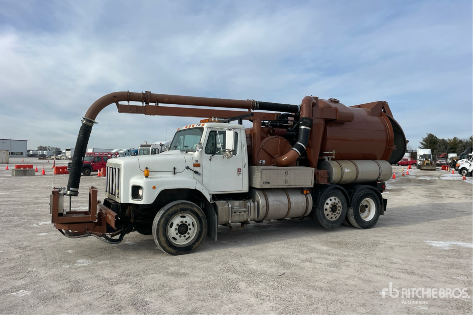 International 530 6 Cylinder 531 cid Diesel 275 hp Engine, 1996 US EPA Label, 8083 Engine hrs, Allison Automatic Transmission, 315/80R22.5 Front Tires, 11R22.5 Rear Tires, Steerable Air Lift Pusher Axle, Dual Steering Boxes, Double Frame, Spring Suspension, 202 in Wheelbase, PTO, Steel Debris Tank, Front Hose Reel, Full Open Tailgate, Hydraulic Tailgate Locks, Telescopic Boom, 8 in Suction Hose, Pump w/ Engine, Remote Control w/Cord