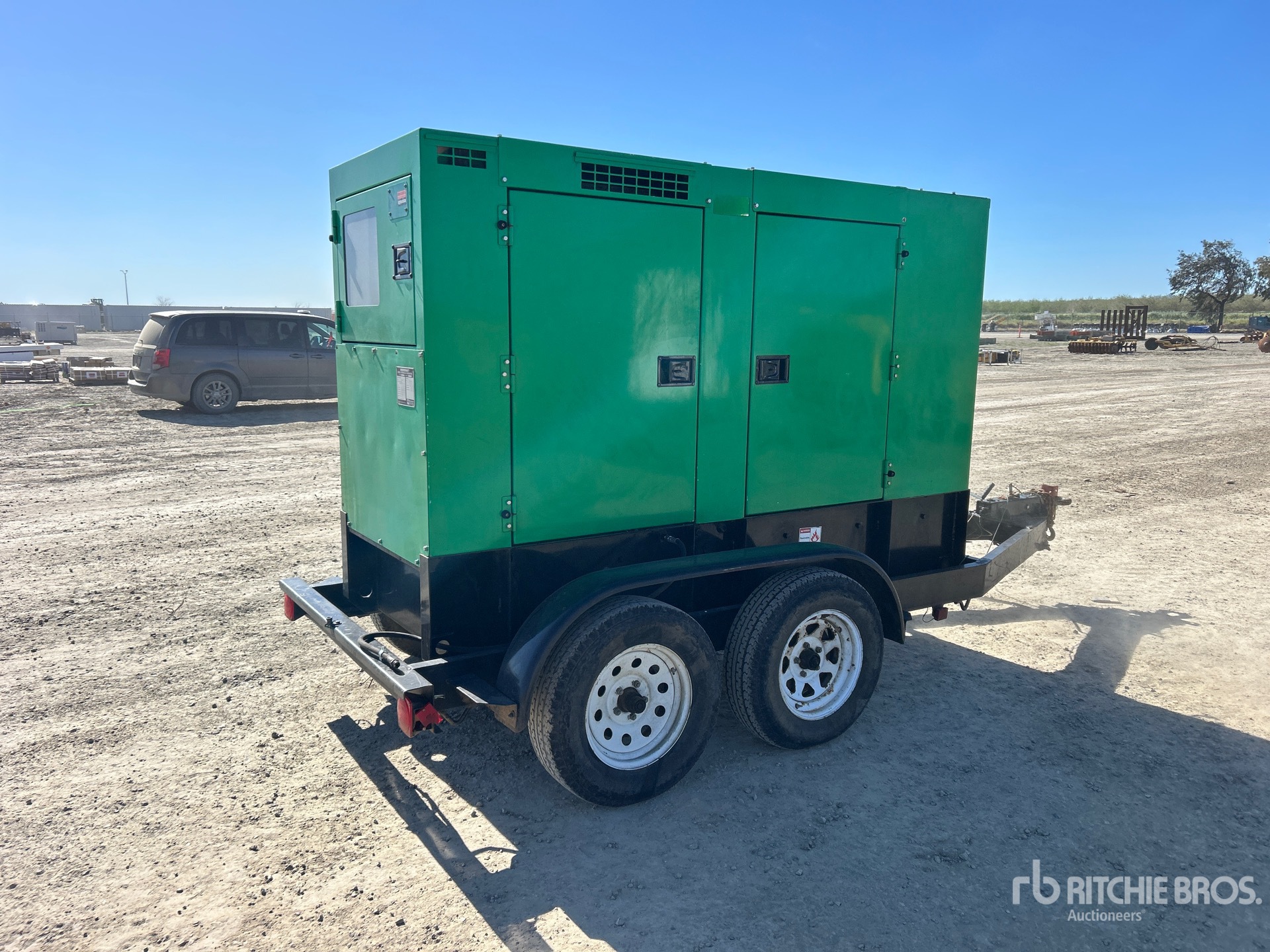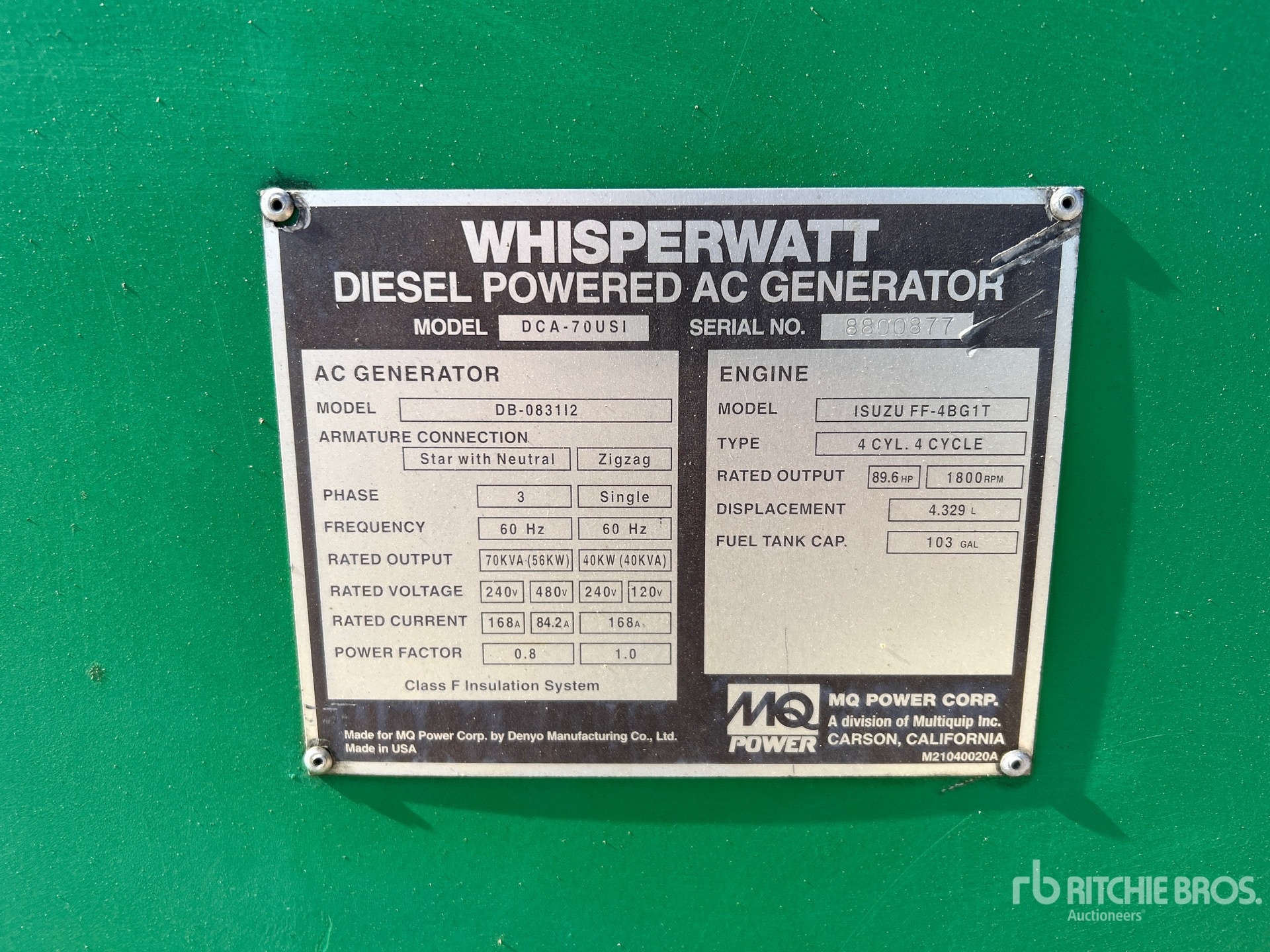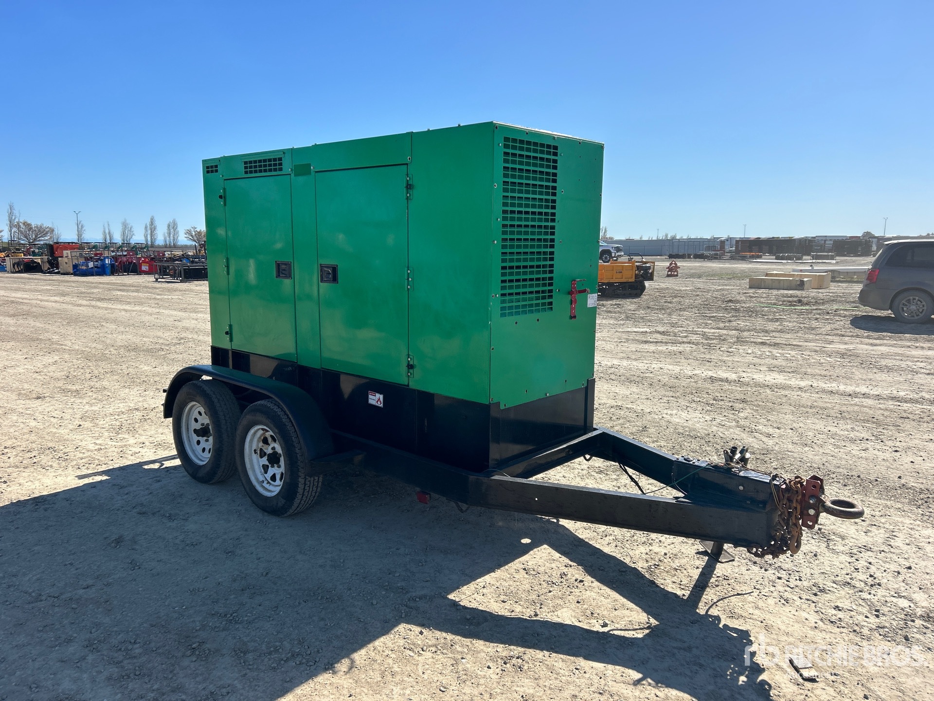 2006 US EPA Label, Isuzu FF-4BG1T 4.329 L Diesel Engine, 70 kVA/56 kW Rated 3 Phase Output, 240 V / 480 V Rated Voltage, 40 kVA,/40 kW, Rated Single Phase Output, 240 V / 120 V Rated Voltage, 120 V Receptacles, Bottom Mounted Fuel Tank, Lunette Ring Carrier Trailer, Surge Brakes